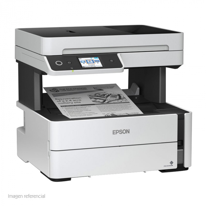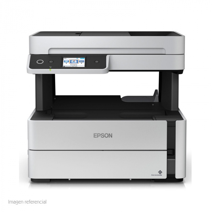 Multifuncional de tinta Epson EcoTank ET-M3170, imprime/escanea/copia/fax, USB/LAN/WiFi. Imprime 20 ppm (negro), escaneo a 1200x2400 ppp, bandeja de entrada: 250 hojas, alimentador automático de documentos (ADF), bandeja de salida: 100 hojas, conectividad USB / LAN / WiFi, voltaje de alimentación: 100-240V.